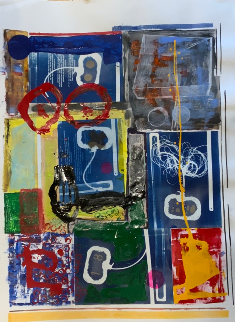 The composition fragments into rigid compartments and overlapping rectangles, a relentless grid that refuses organic flow. White circular and curved forms punctuate the surface with modular logic and serial organization.